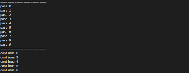 코딩을 하다보면 특정 라인만 실행하거나 그렇지 않게 하고싶은 경우가 있다. 이럴경우에 주로 사용하는것이 pass와 continue인데, 상황에 따라 다르게 쓰인다. 고로 예제를 통해 pass와 continue 둘의 차이를 알아보자.