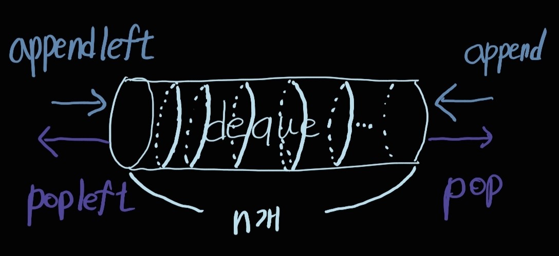 양쪽 끝에서 삽입과 삭제가 모두 가능한 자료 구조다. 두 개의 포인터를 사용하여, 양쪽에서 삭제와 삽입을 발생 시킬 수 있다. (큐와 스택을 합쳐놓은것이라 볼 수 있다.) 양쪽 삽입과 삭제는 append 와 pop명령어를 사용하며 아래의 그림과 같다.