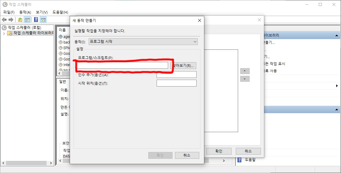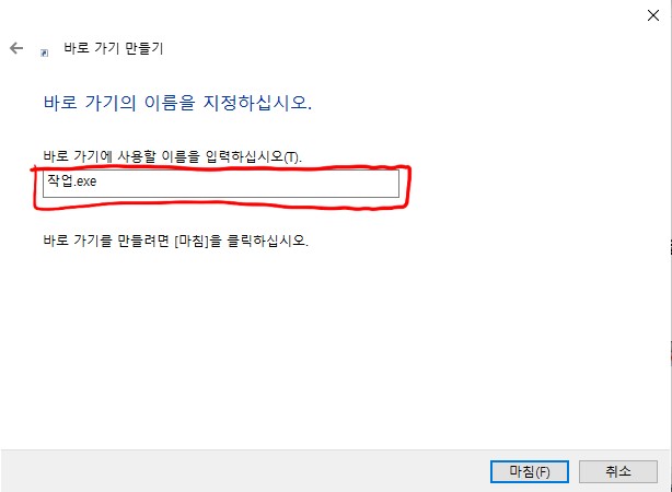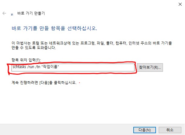 바로 가기 항목 위치 입력 ex) "schtasks /run /tn 작업 이름 입력"