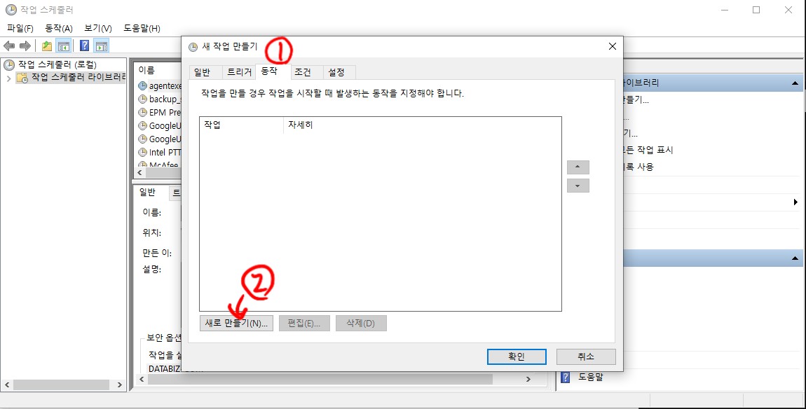 왼쪽 하단의 작업 스케줄러 라이브러리 클릭 후 오른쪽 작업창의 작업 만들기 클릭