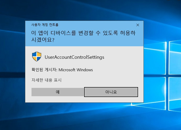 UAC 프롬프트 알림 창을 제외하기 위한 라디오 버튼 체크