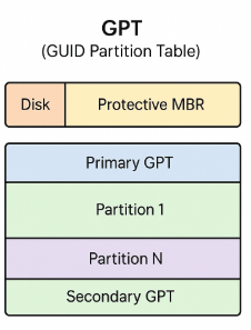 - GPT (GUID Partition Table): 차세대 파티션 구조. 이론상 8ZB까지 지원. 섹터 주소를 64bit로 저장함. 파티션 테이블 개속가 128개이고, 각 파티션 테이블 당 128 Byte씩을 사용.