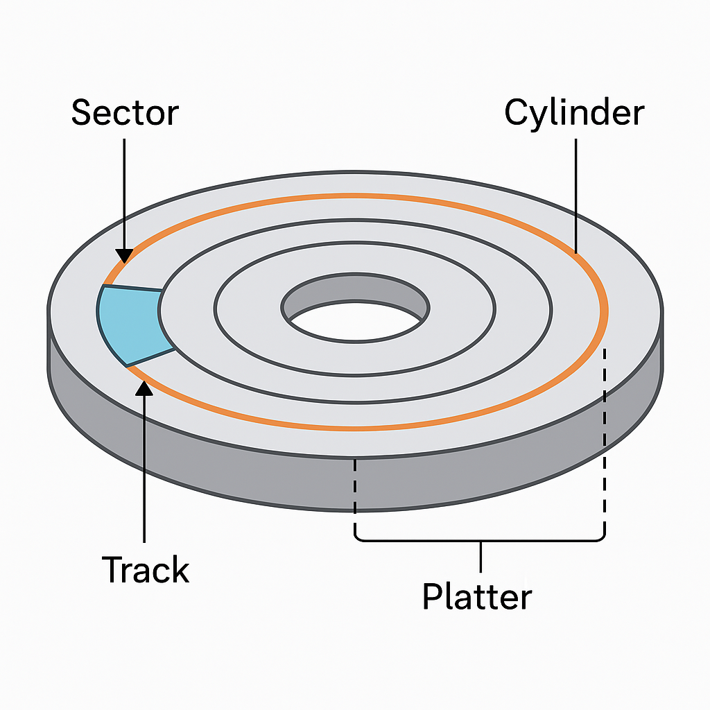 - 실린더(Cylinder): 동일 반경의 트랙들이 위에서 아래로 쌓인 구조.