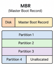 - MBR (Master Boot Record): 디스크의 첫 번째 512바이트. 파티션 테이블과 부트 로더가 저장됨. 최대 2TB까지만 지원, 파티션 4개까지. MBR 파티션은 섹터의 주소를 4 Byte로 저장함으로 주소가 나타낼 수 있는 디스크의 최대 크기는 2TB임.