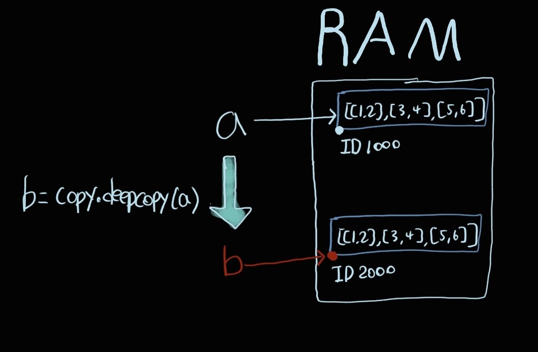 진정한 복사는 깊은복사 deepcopy라고 생각한다. 얕은복사에 비해 깊은복사에서 2개의 변수는 각각의 주소값을 따로 가리키고 있다. 즉 깊은복사는 변수a와 변수b를 독립적인 개체로 나타낼 수 있으며, 메모리또한 같다.