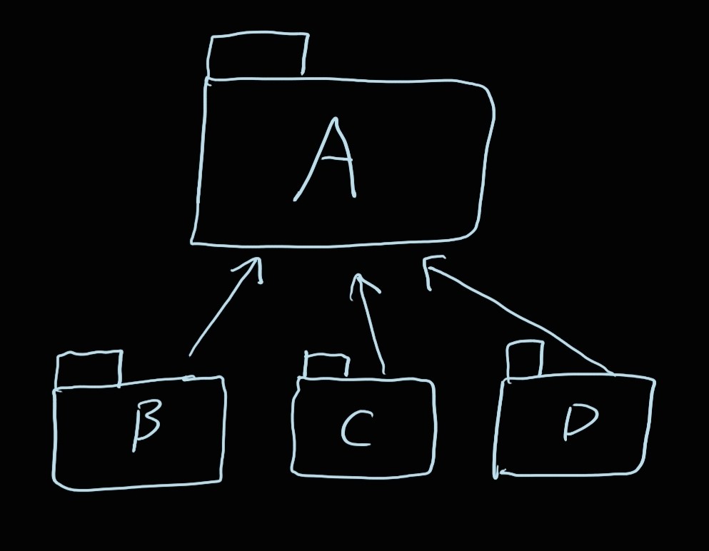 우선 A폴더는 다른 폴더를 의존하고 있다. 이럴경우 의존하는 폴더(B,C,D)가 조금이라도 변하게 된다면, A폴더는 변화한것을 토대로 자신도 그에 맞춰 변화해야한다. 이럴경우 의존성때문에 의존을 하고있는 많은 패키지의 코드를 전부 손을 대야하는 상황을 마주칠 수 있다.